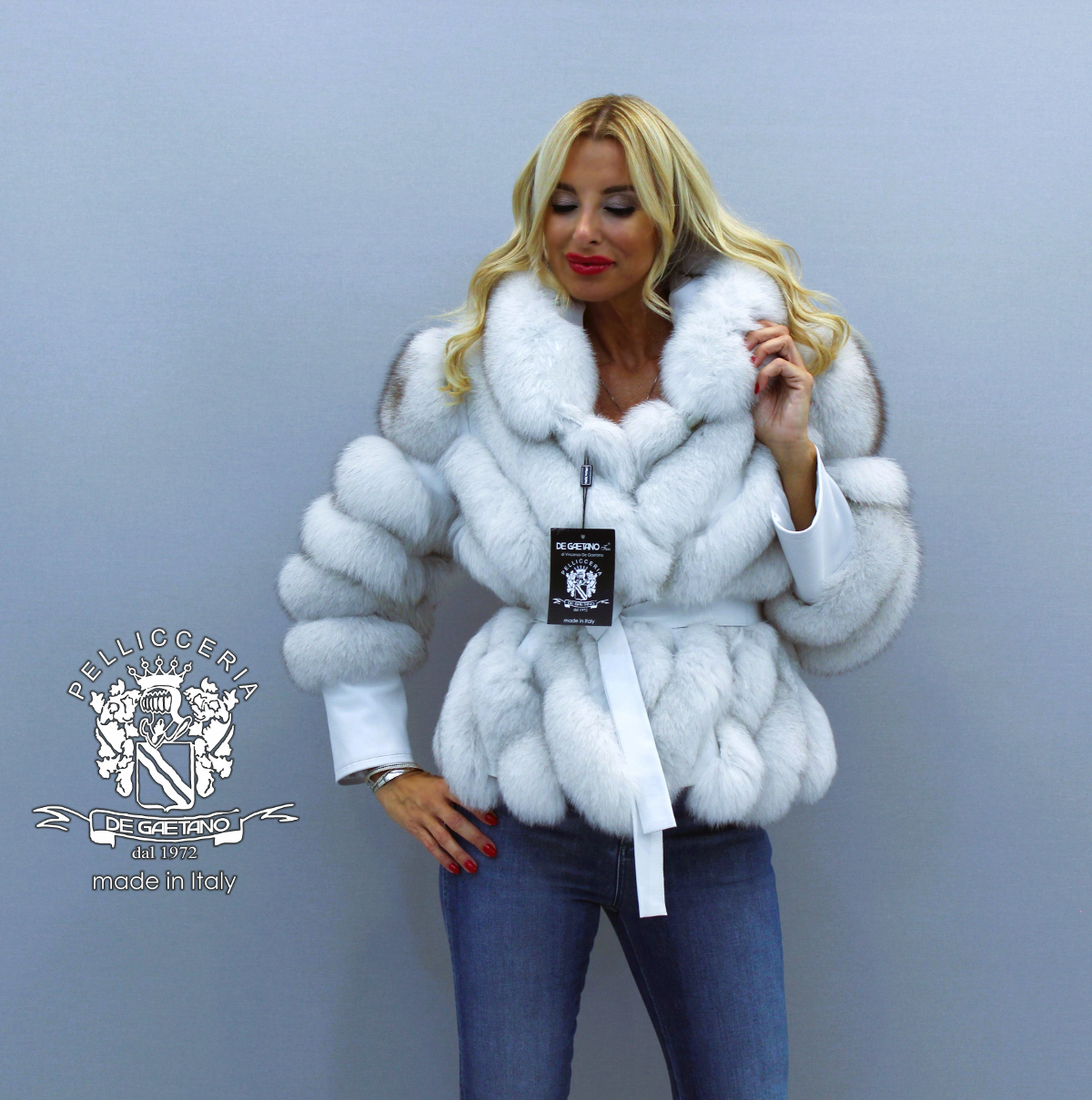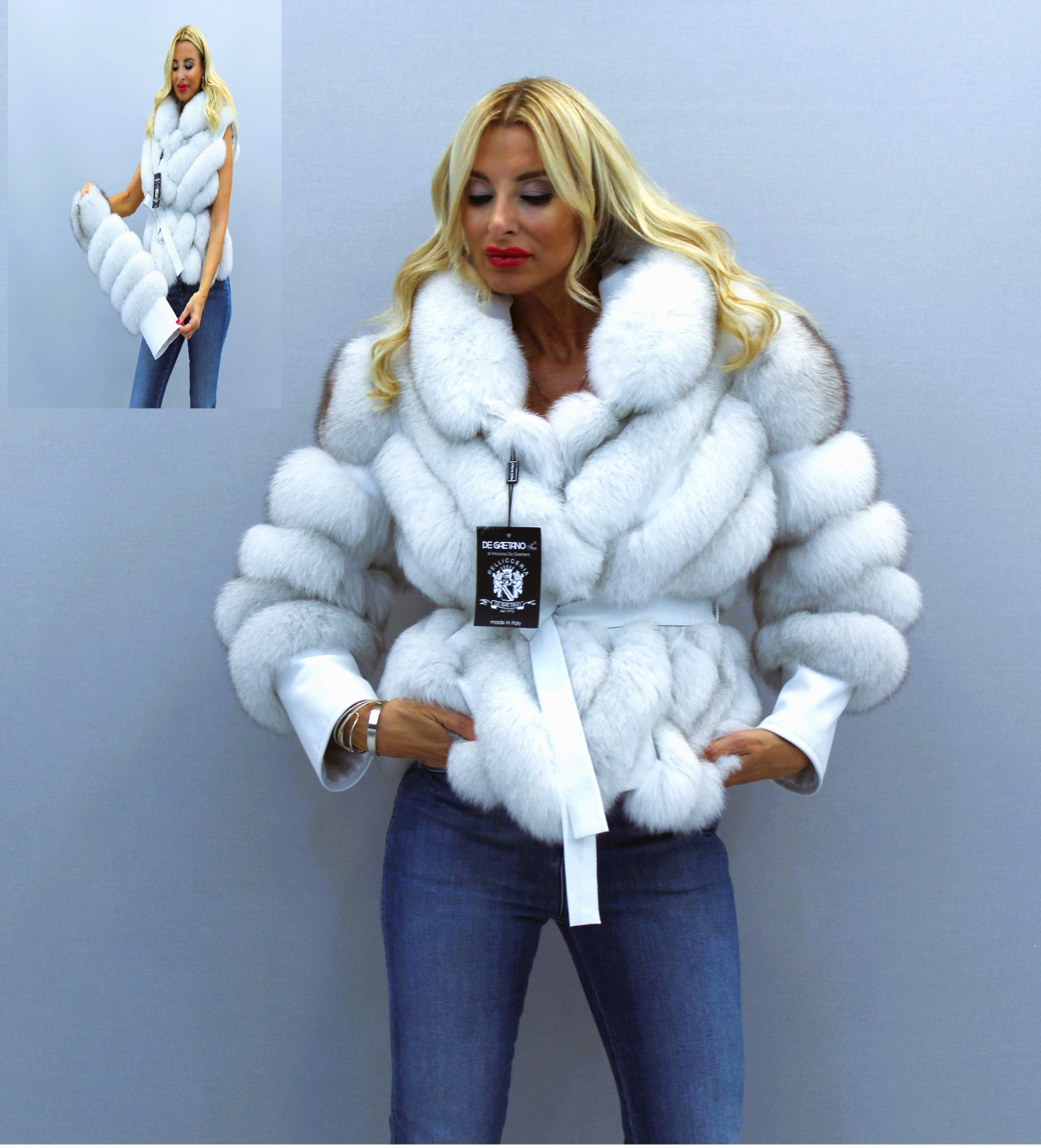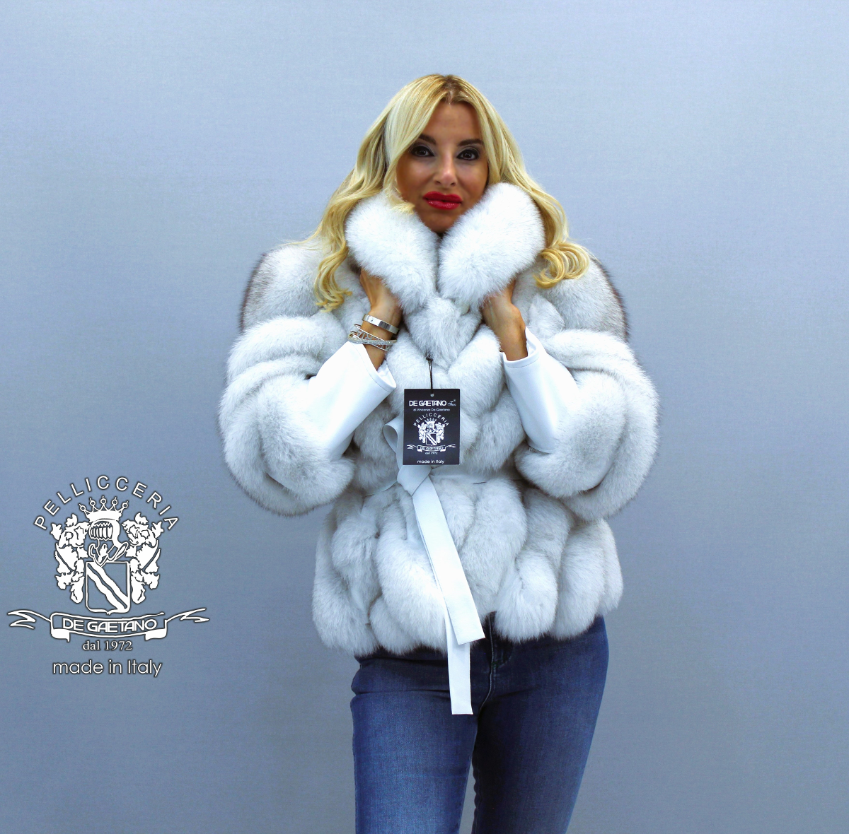 Giacca di volpe della groenlandia con cappuccio . Lavorazione orizzontale a pelli intere con inserti in vera pelle ( di agnello ) bianca.