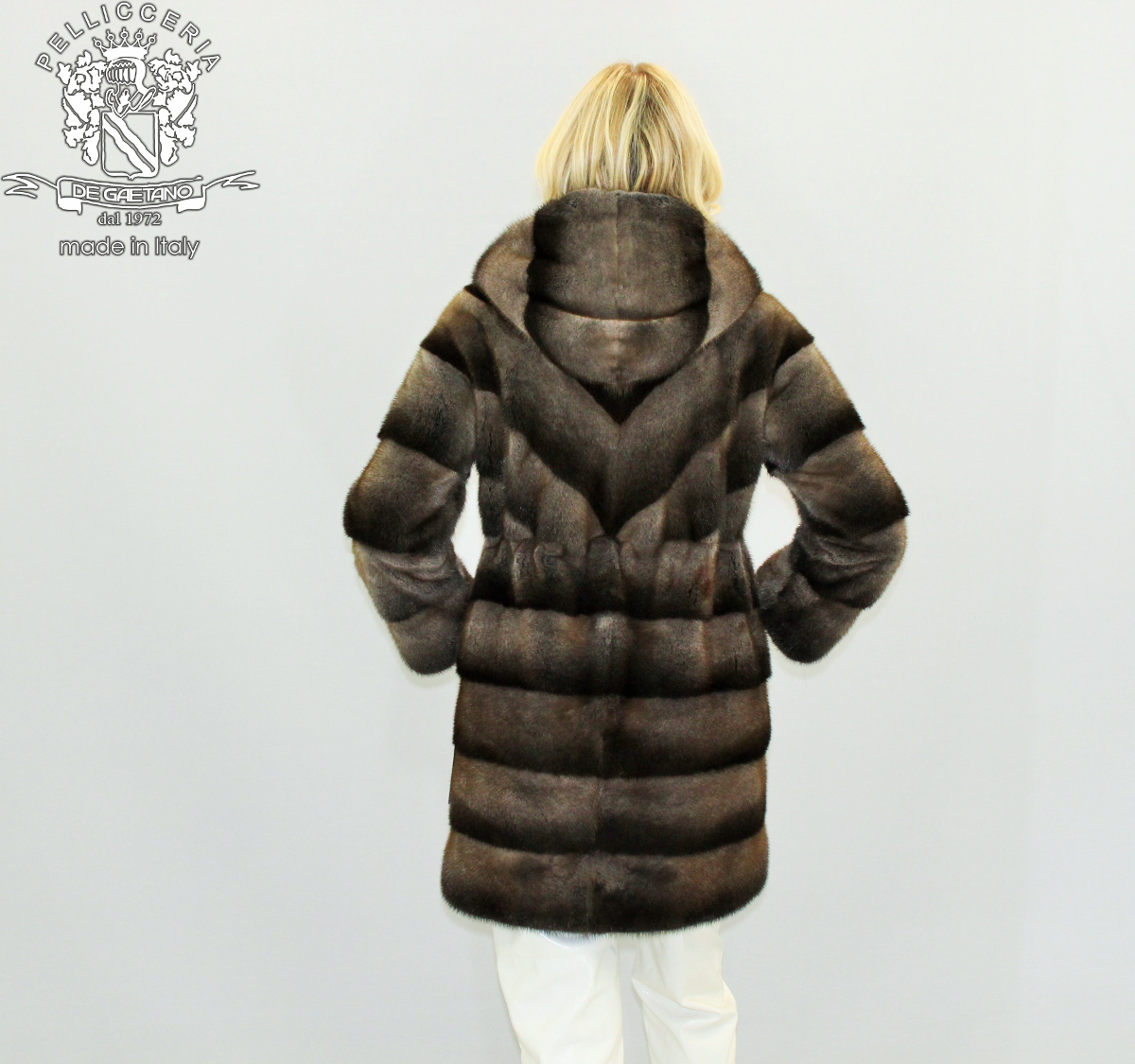 ll modello racconta il gusto elegante dell’inverno con una linea femminile arricchita dal cappuccio avvolgente .