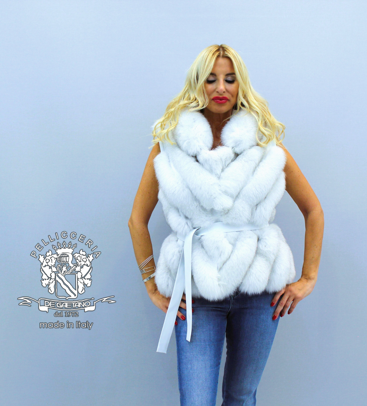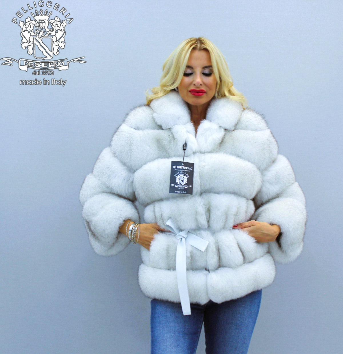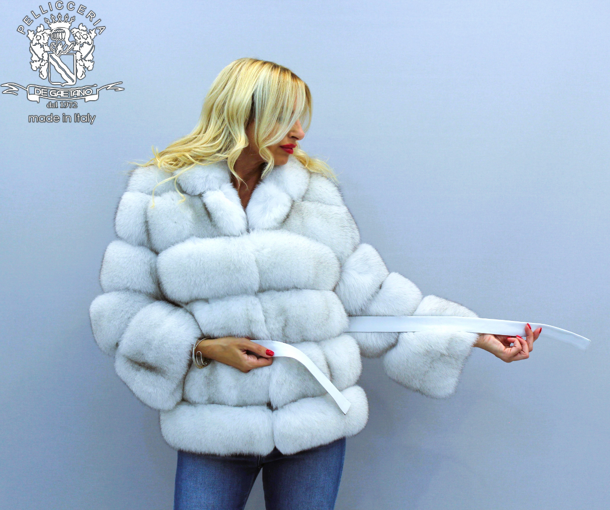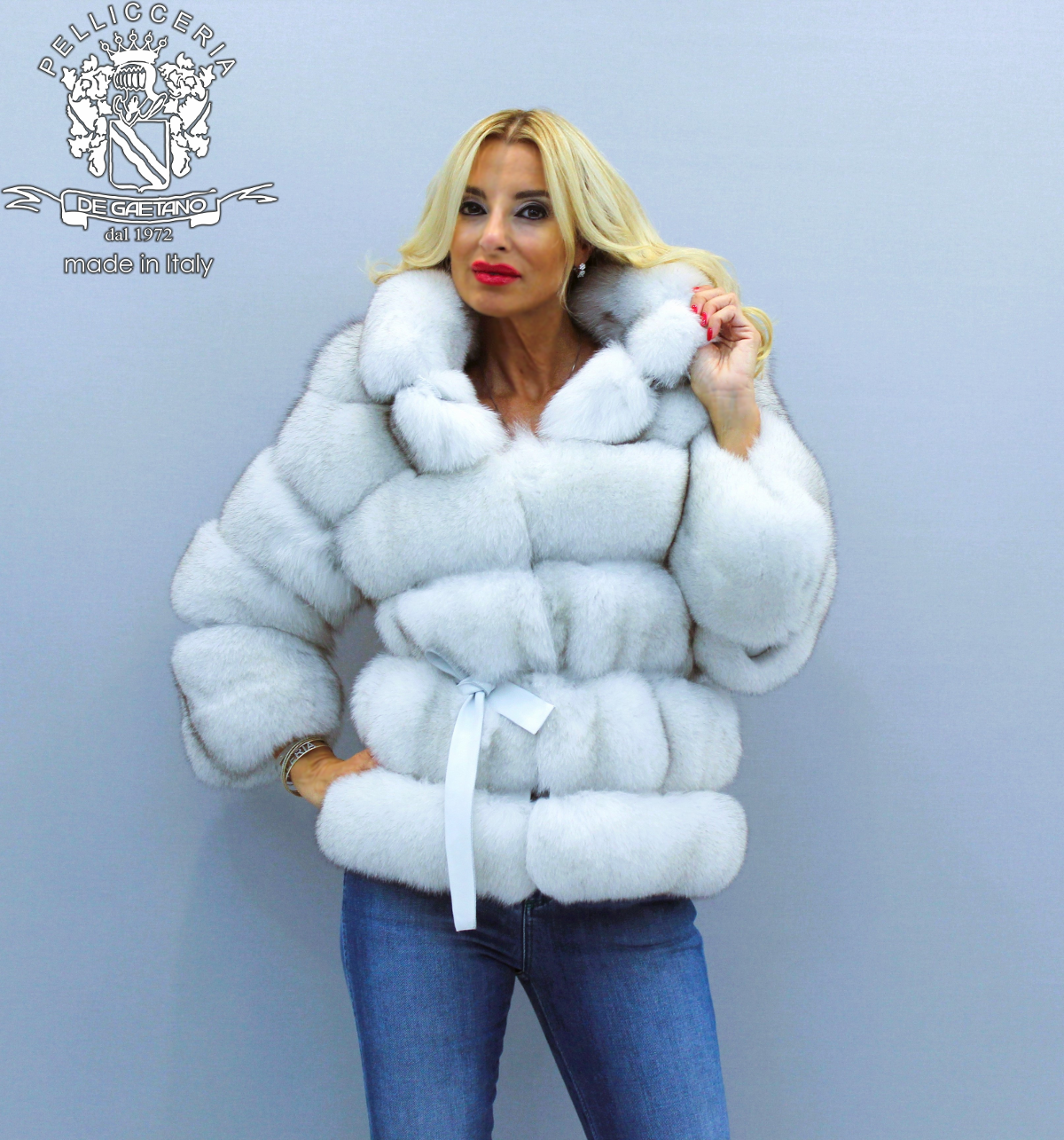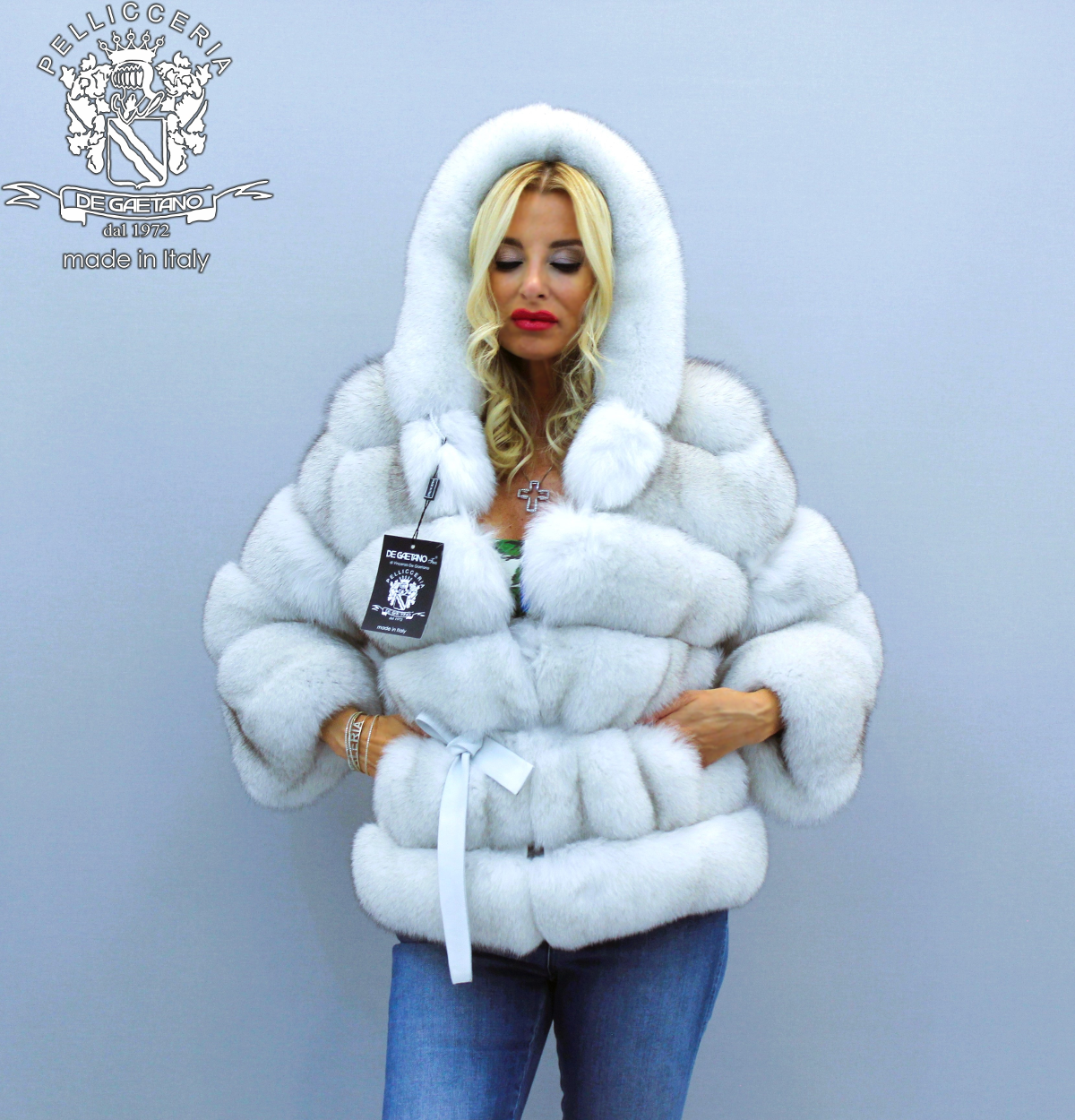 Giacca di volpe blue fox con cappuccio e cintura di pelle.