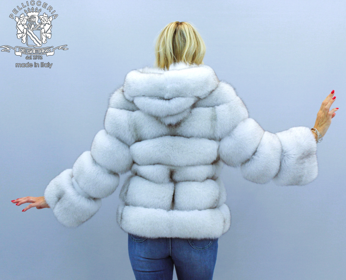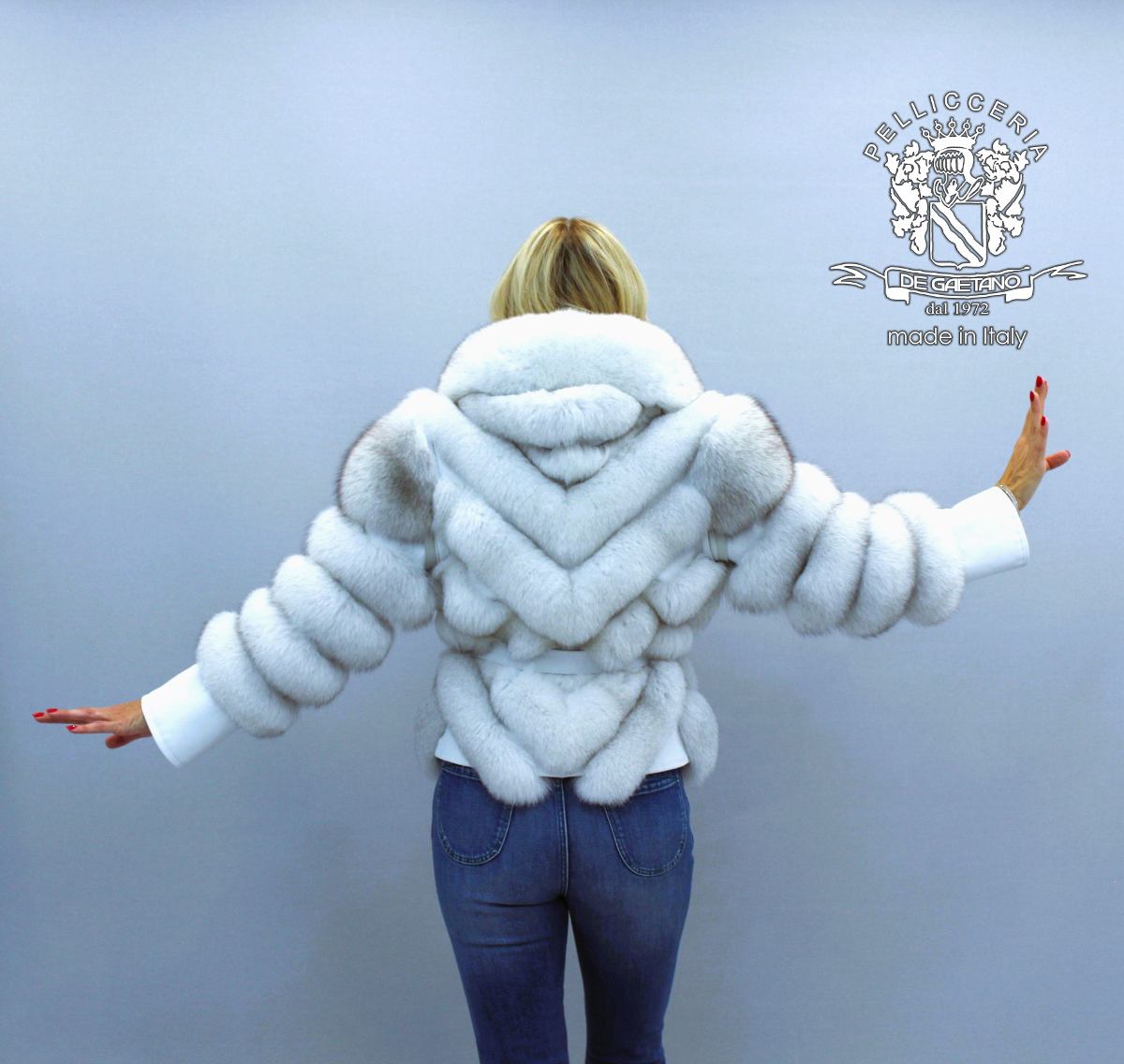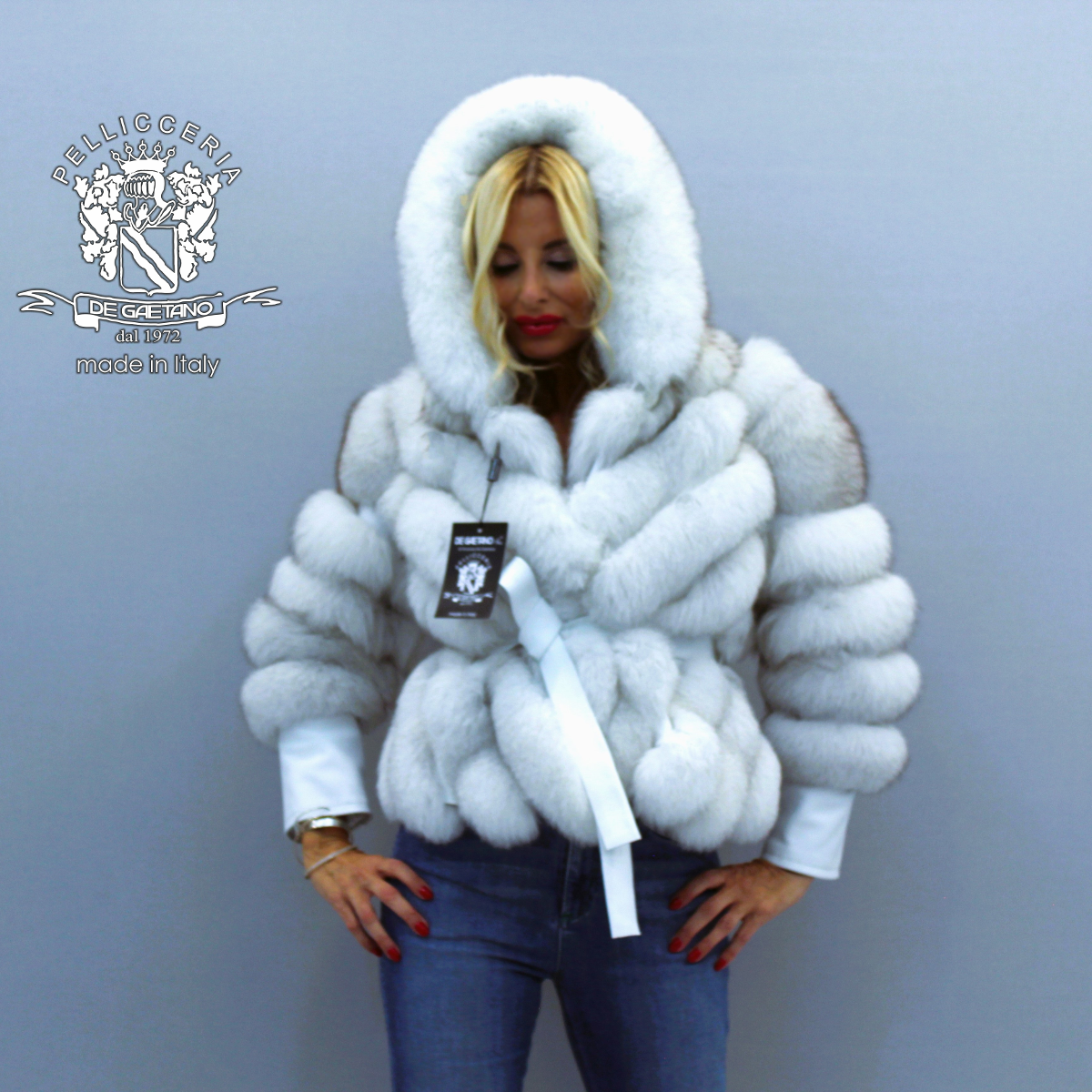 Giacca di volpe della groenlandia con cappuccio e zip. Lavorazione orizzontale a pelli intere con inserti in vera pelle bianca.