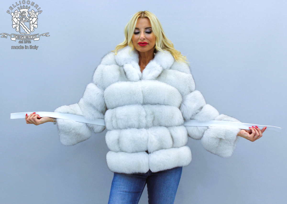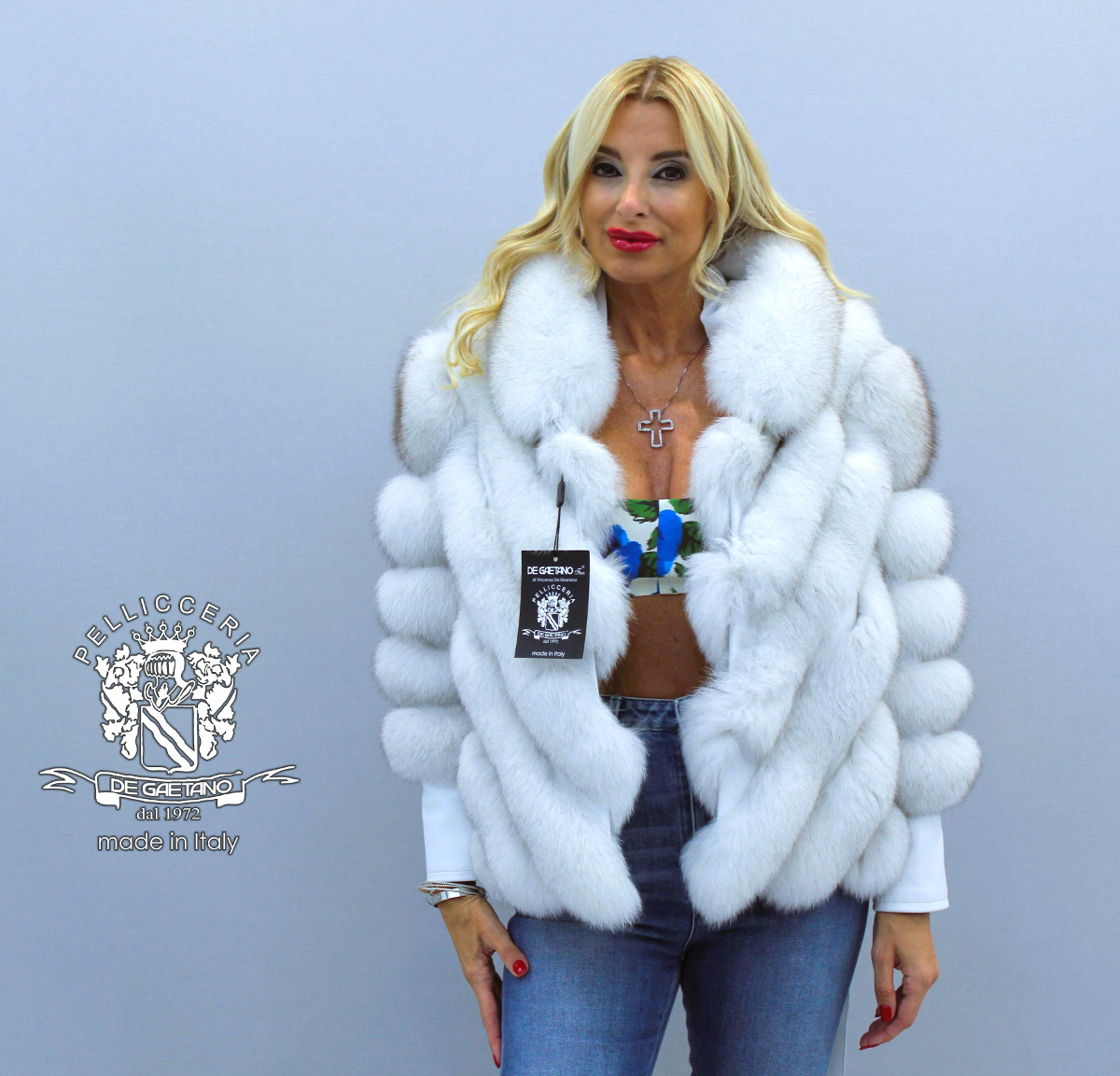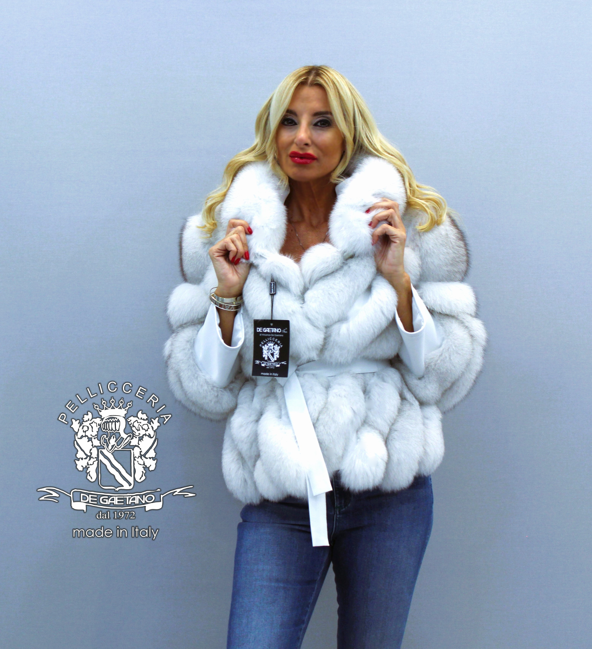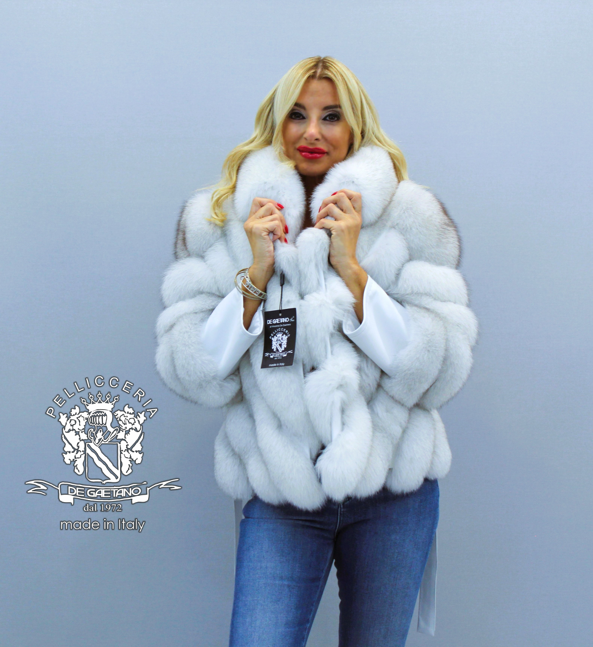 Giacca di volpe della groenlandia con cappuccio e zip. Lavorazione orizzontale a pelli intere con inserti in vera pelle bianca.